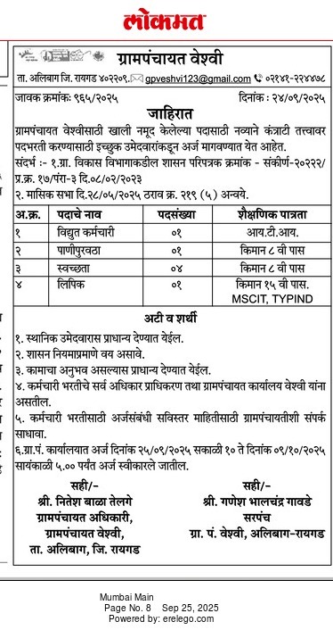 • नोकरी ठिकाण: ग्रामपंचायत वेश्वी, ता. अलिबाग, जि. रायगड